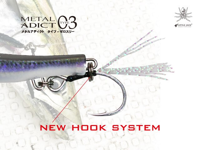 The curved left-right asymmetrical real shape that gives a feeling of life, the irregular reflection of the surface due to the shape, and the silhouette at the time of fall. They make Metal Adict-03 appeal naturally. Adopts a semi-fixed large tinsel hook mounting system with two eyes on the rear that allows you to mount a large hook and set the hook closer to the main unit. The biggest feature is that it can be used with a large hook, and eliminates the entanglement between the line and the hook. By removing the rear hook, it is possible to perform irregular actions like a general metal jig.