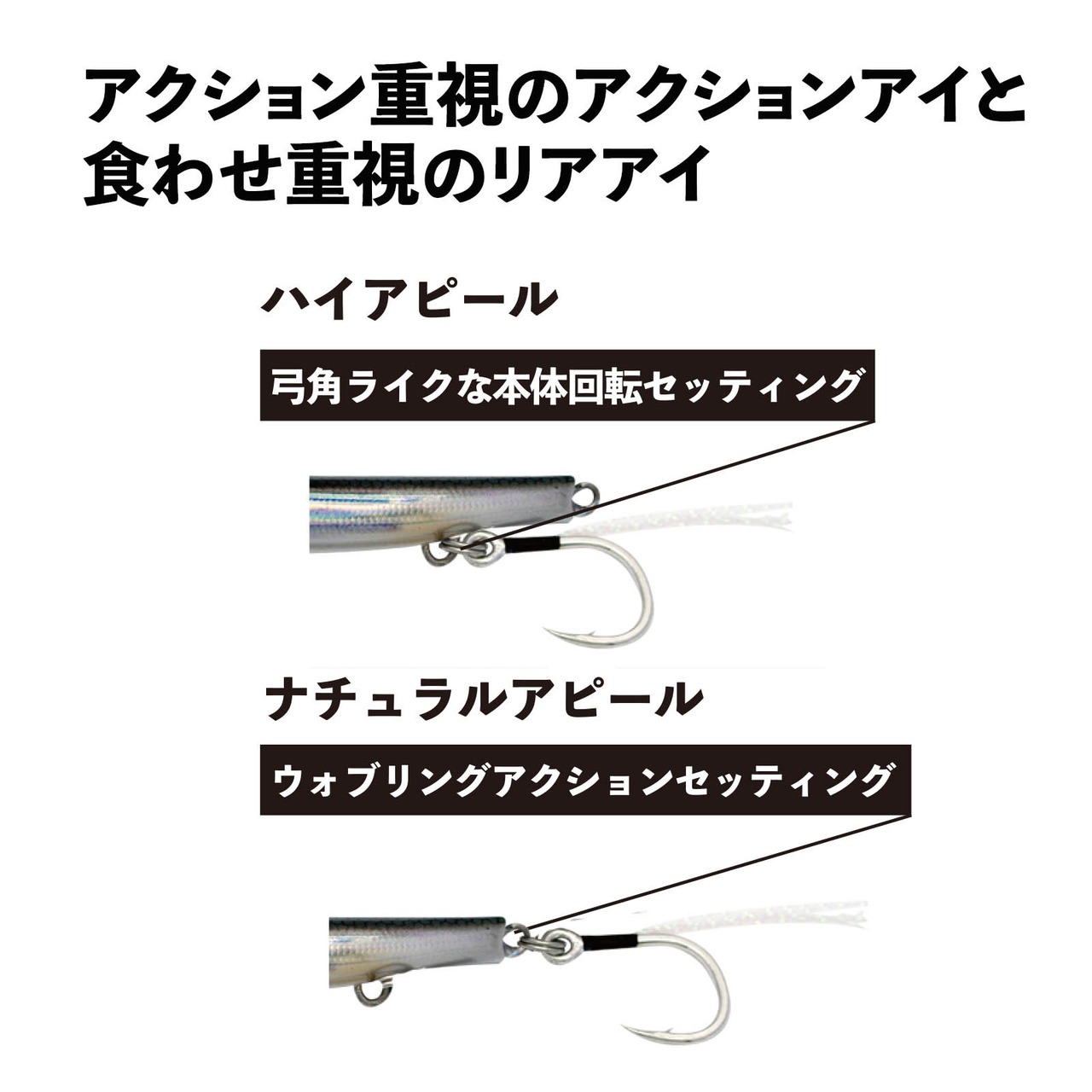 デフォルトのフック位置はアクションアイで激しくアピールし、ターゲットの活性があまり高くない時や反応はあるもののなかなか掛からない場合にはリアにフックを取り付ける事でアクションを抑えつつフッキングポイントが伸びるため効果的に掛けることができます。